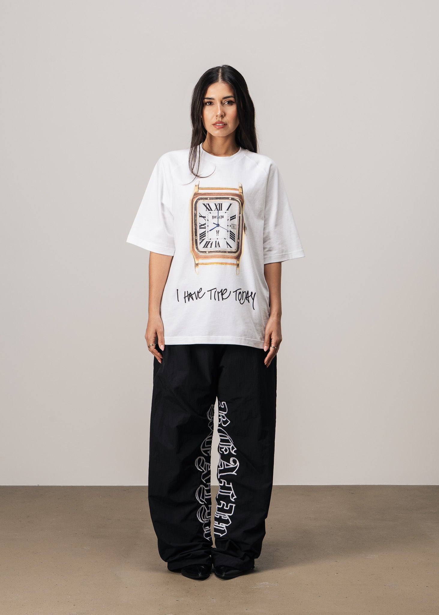 On the front, a striking analog clock graphic takes center stage. The clock is uniquely crafted to incorporate the brand’s name and logo within its design, while the hands subtly point to form part of the branding itself. The date displayed on the clock represents the founding year of the brand, turning time into a tribute to its origins.