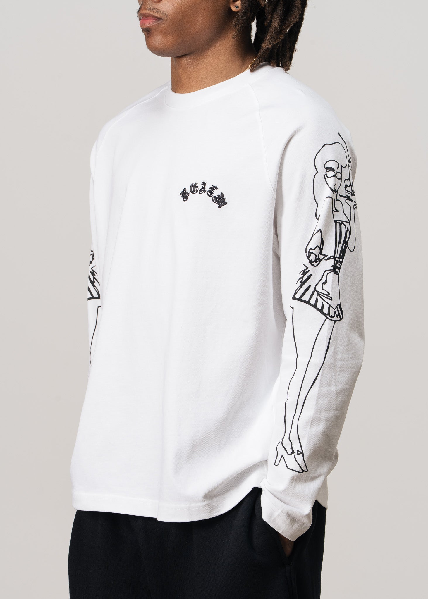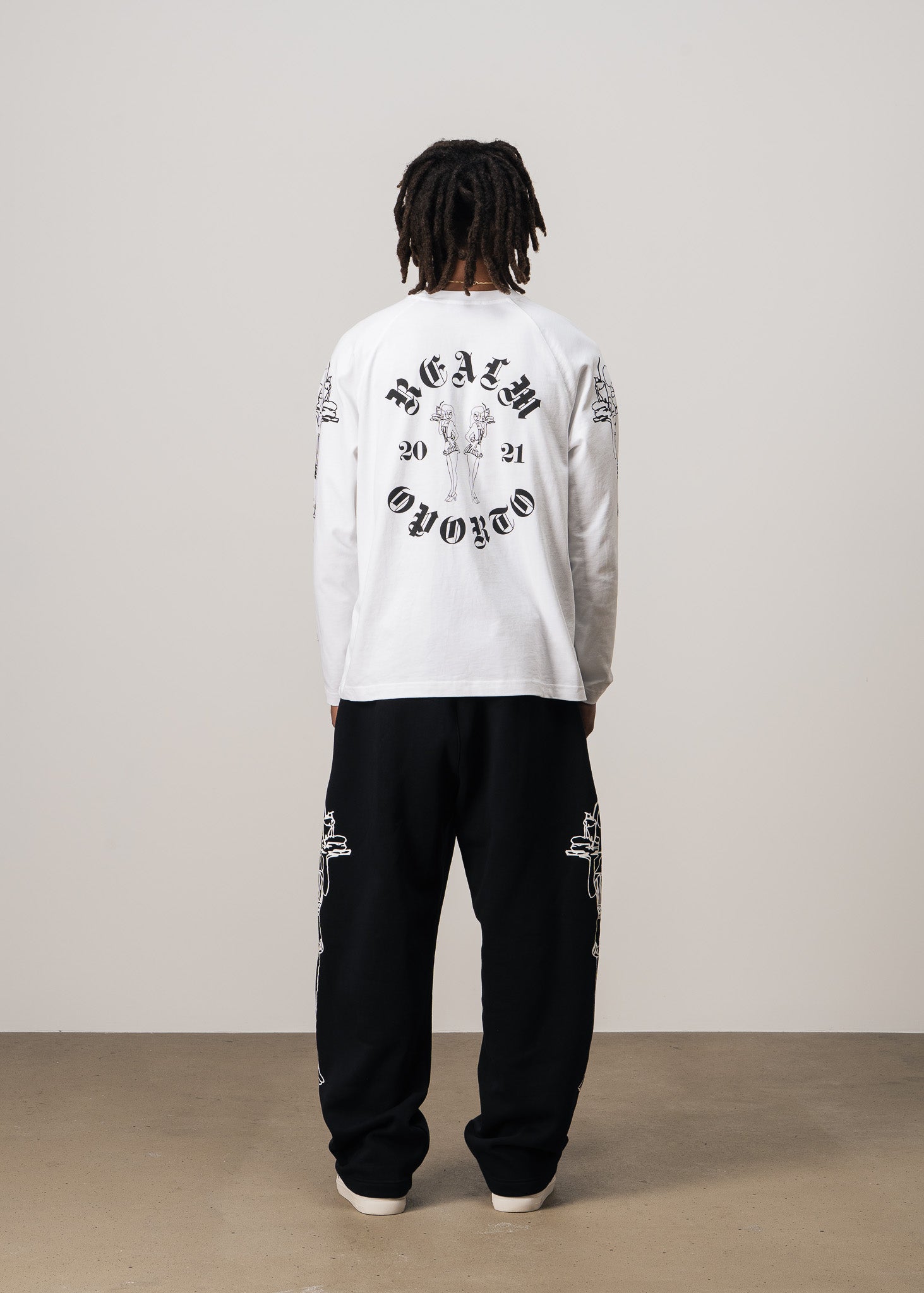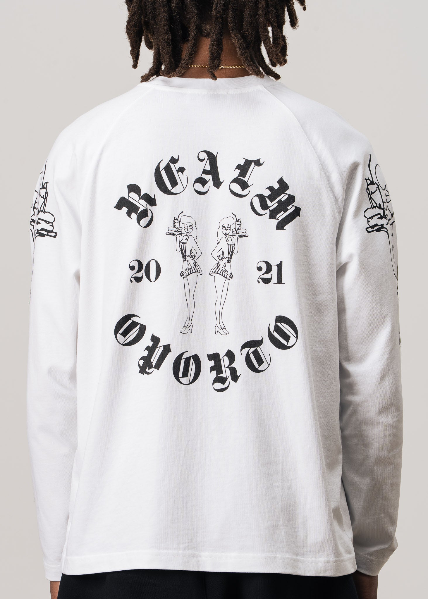 On the front, REALM embroidery sits on the left chest, offering a clean and elevated look. Along each sleeve, striking waitress graphics add movement and personality, turning the arms into a dynamic visual feature. On the back, the brand’s logo is boldly printed.