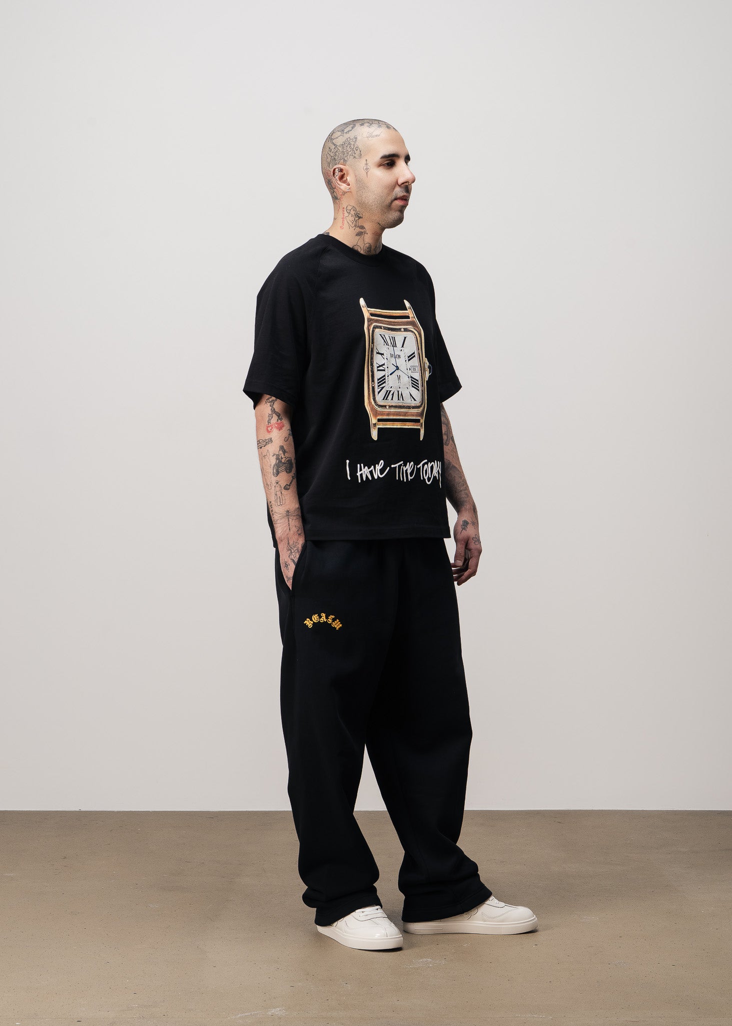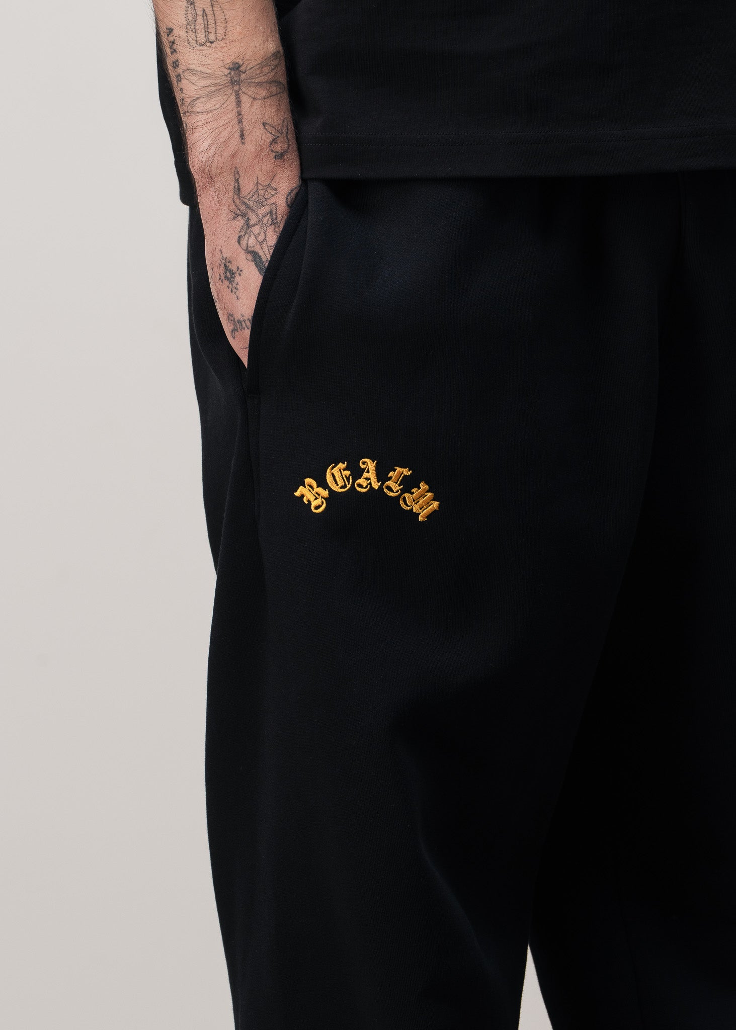 On the right side, just below the pocket, the REALM logo is finely embroidered, adding a subtle yet elevated branding detail. On the left leg, below the knee, a bold side print of the signature waitresses introduces a unique visual element that brings character and movement to the design.